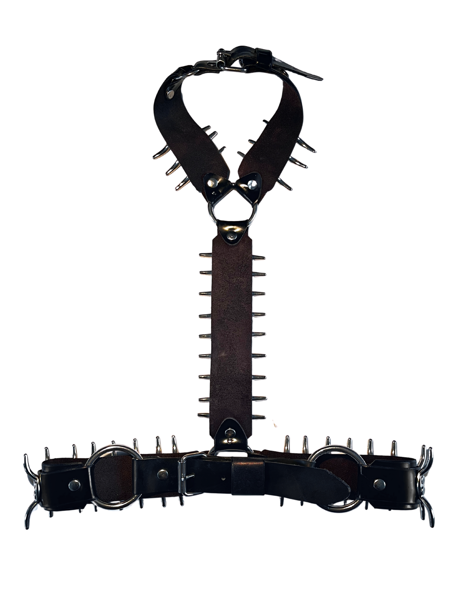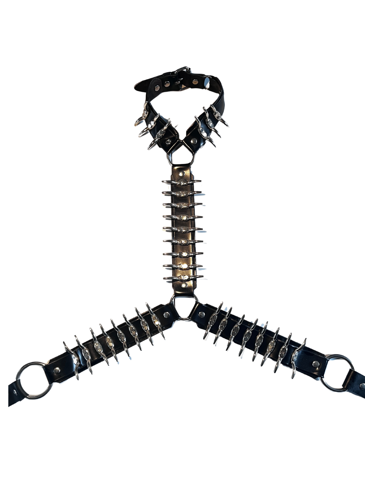 The Snakes and Ladders Harness is a full leather halter piece, fusing collar, chest, and waist into one striking silhouette. With our signature spine hardware running vertically down the front, wrapping the sides, and encircling the neck, this is a statement of control — structured, deliberate, and fiercely bold.