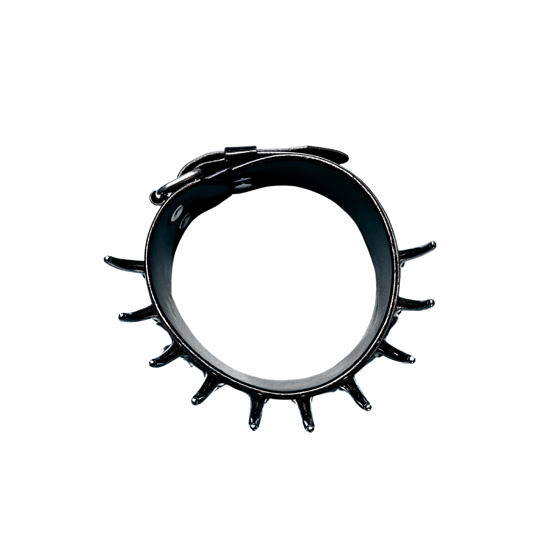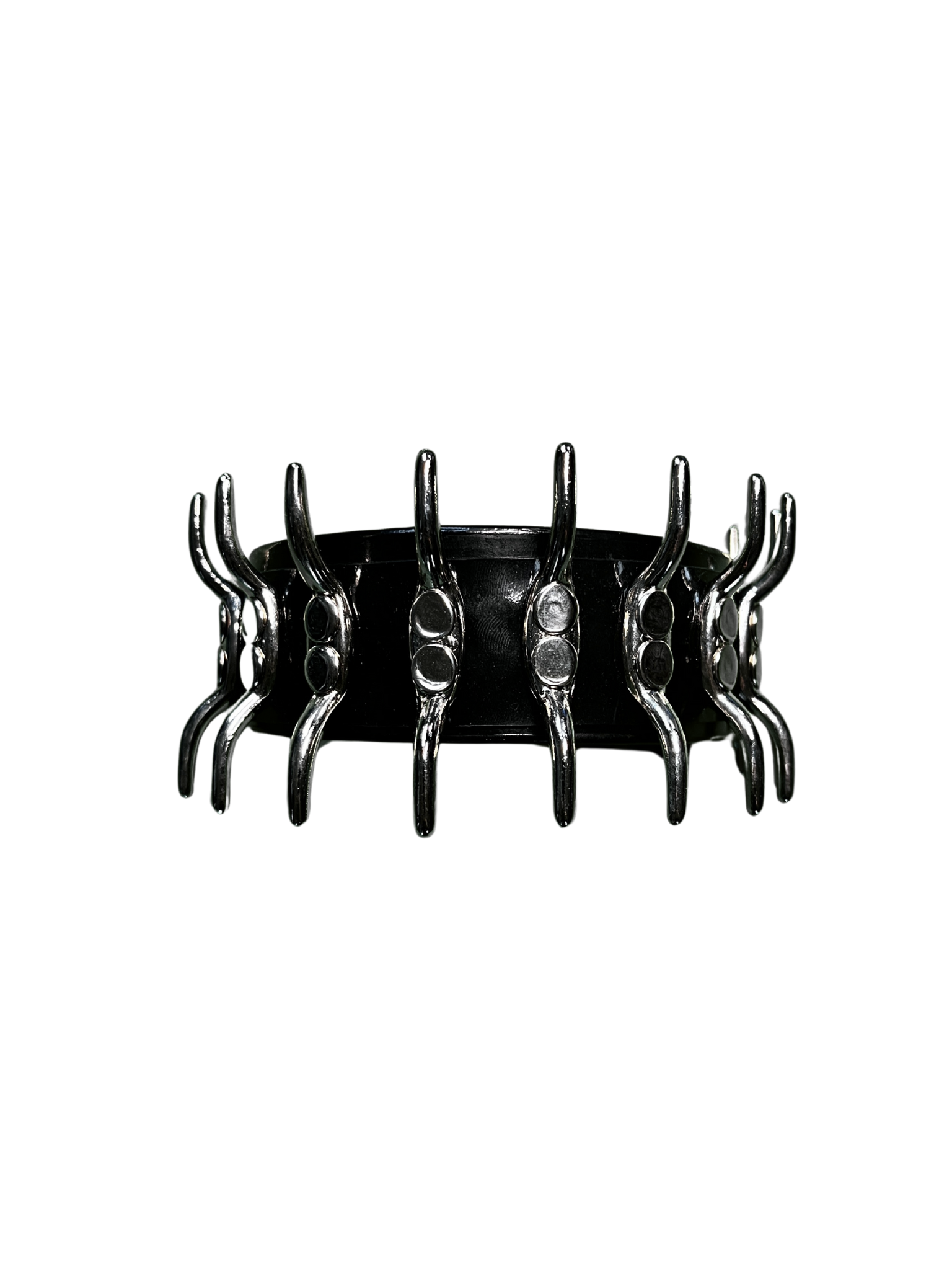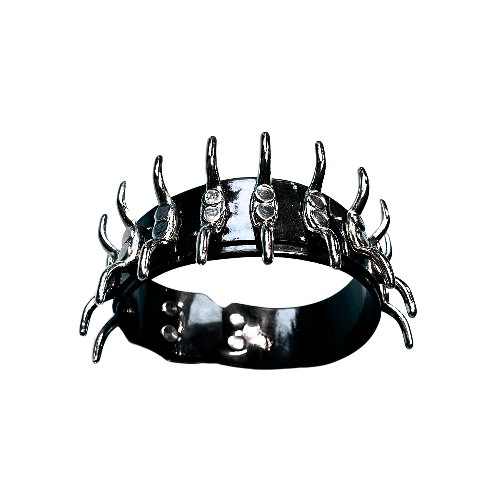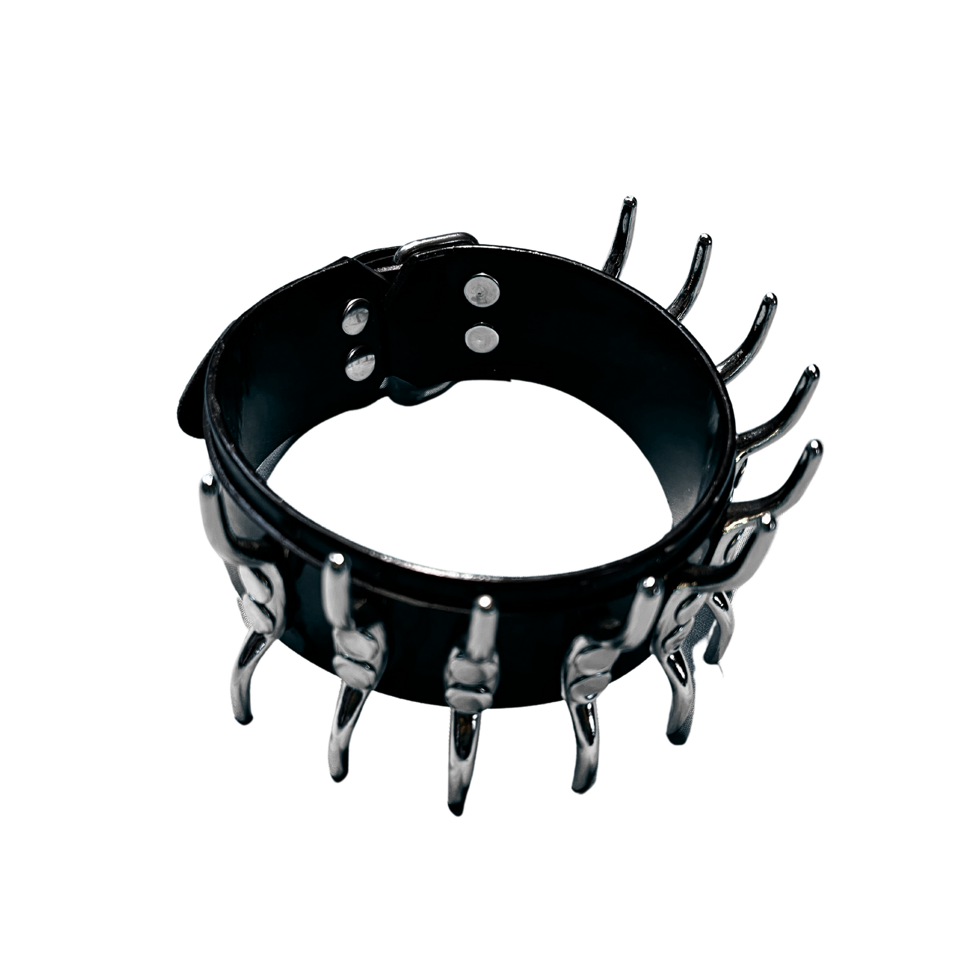 This one bites back. A 4 cm-wide leather collar featuring our signature spine hardware — rigid, heavy, and unapologetic. It walks the line between posture collar and statement piece. Handmade for fashion and edge play.